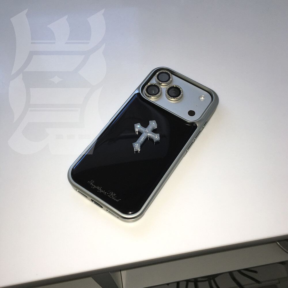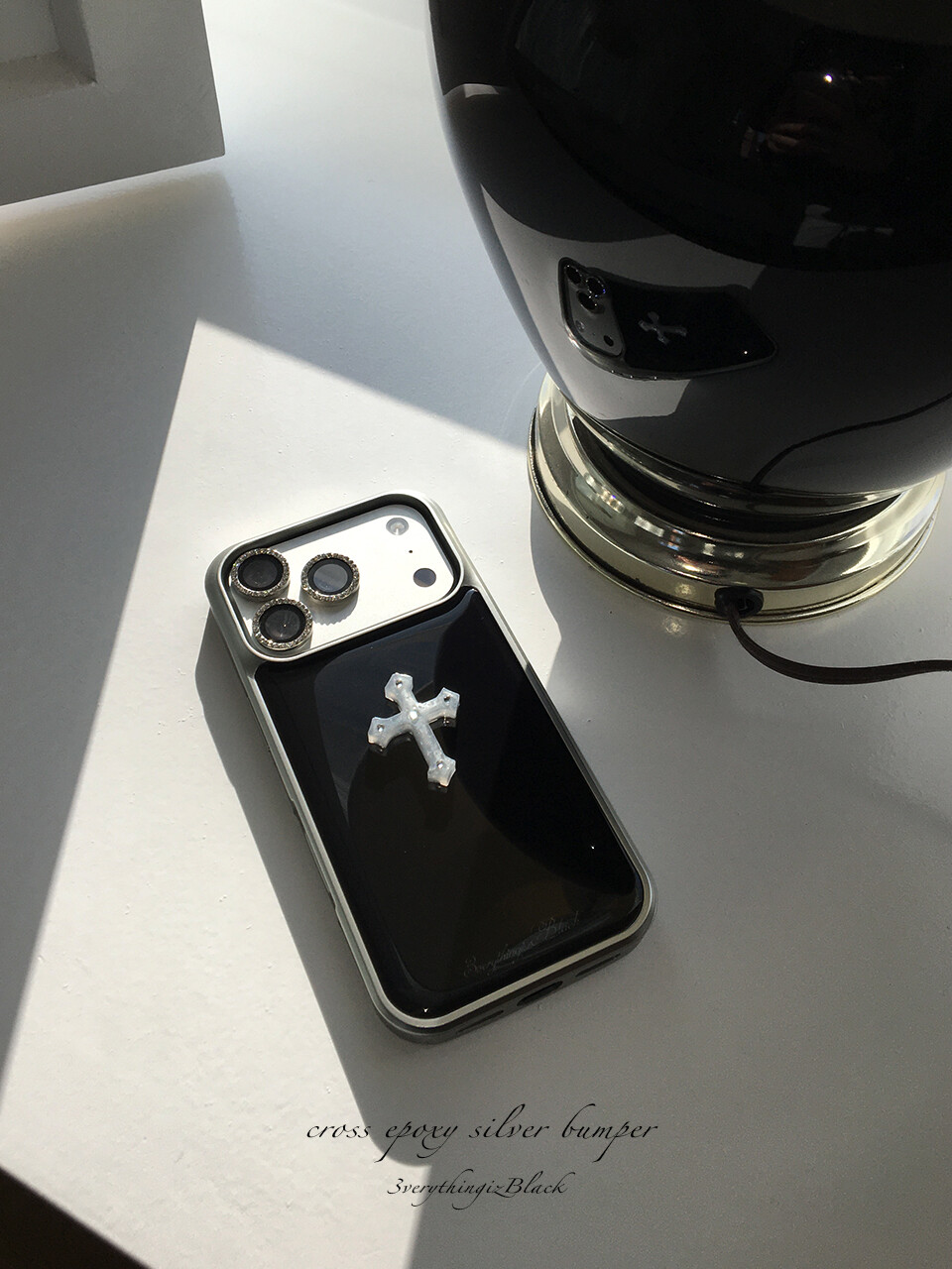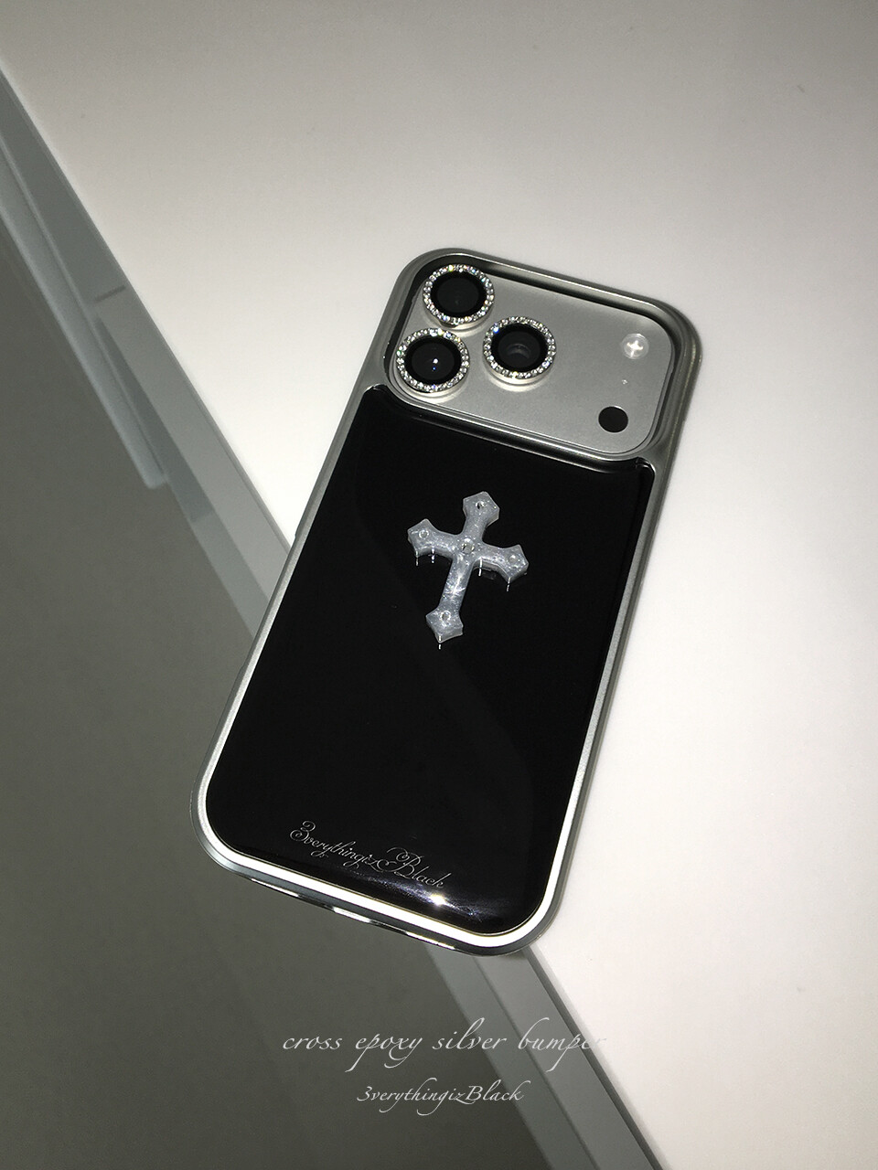 십자가 큐빅 파츠가 부착된 실버 에폭시 범퍼케이스 입니다.