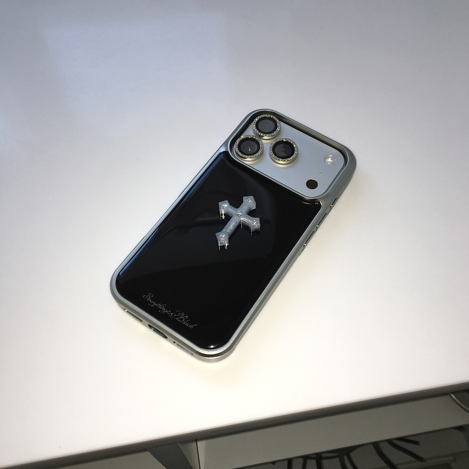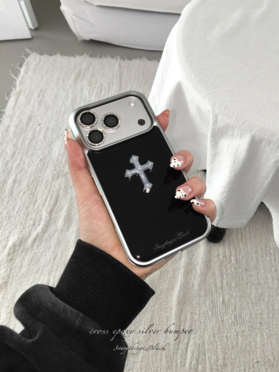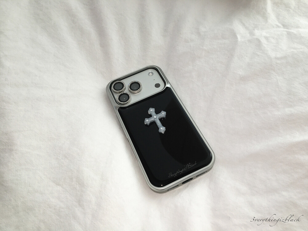 십자가 큐빅 파츠가 부착된 실버 에폭시 범퍼케이스 입니다.