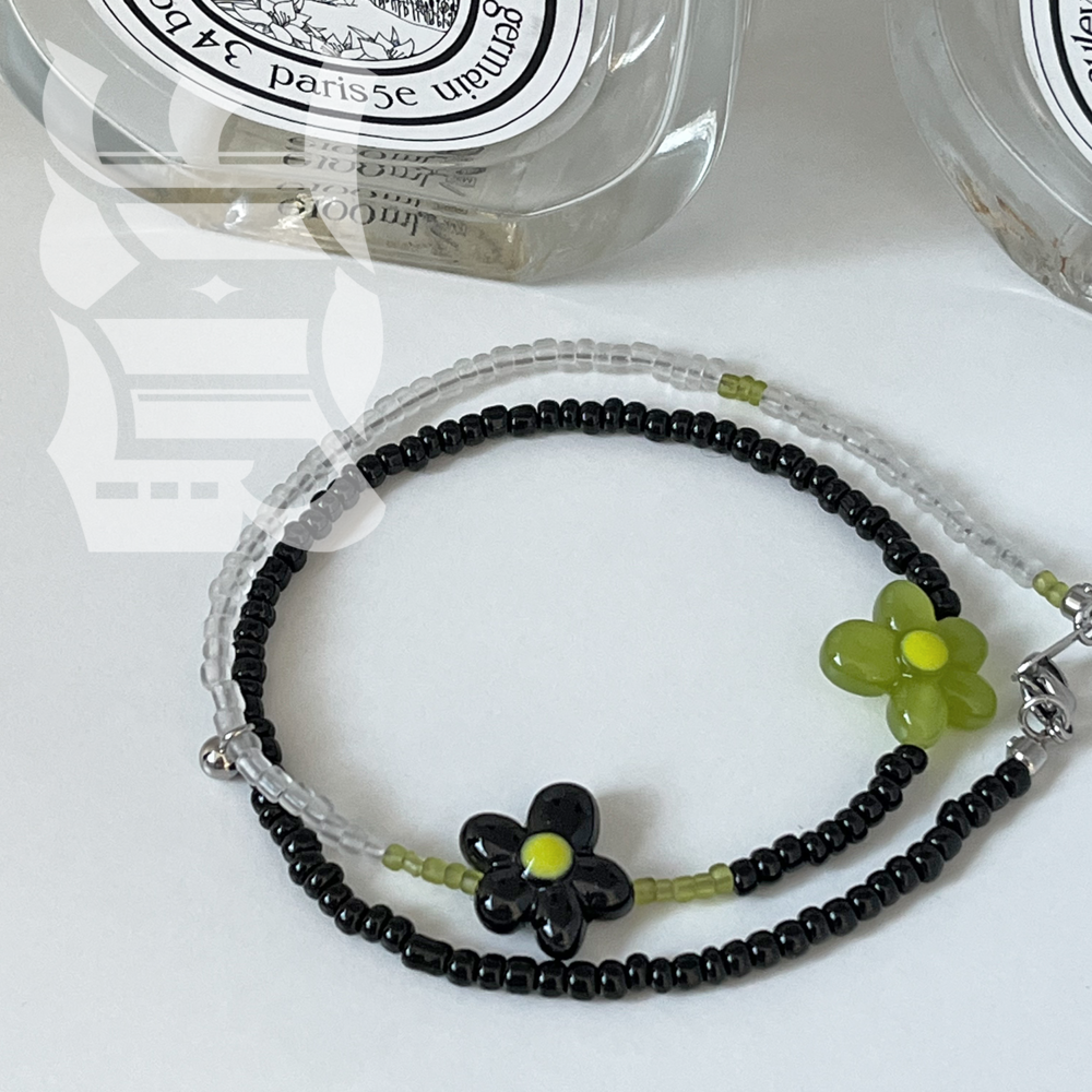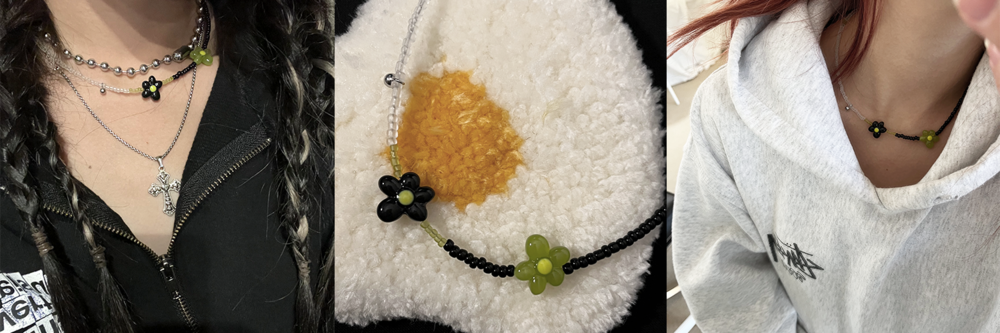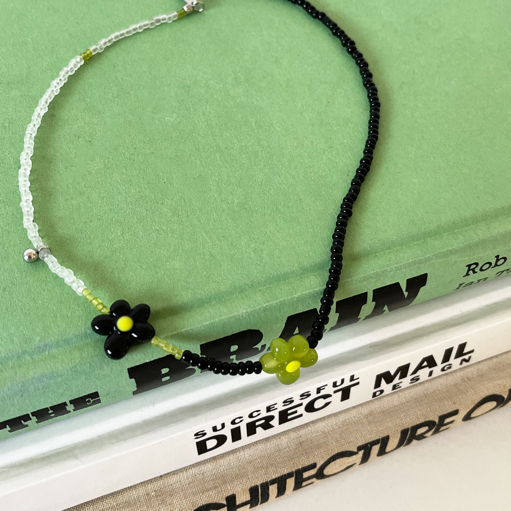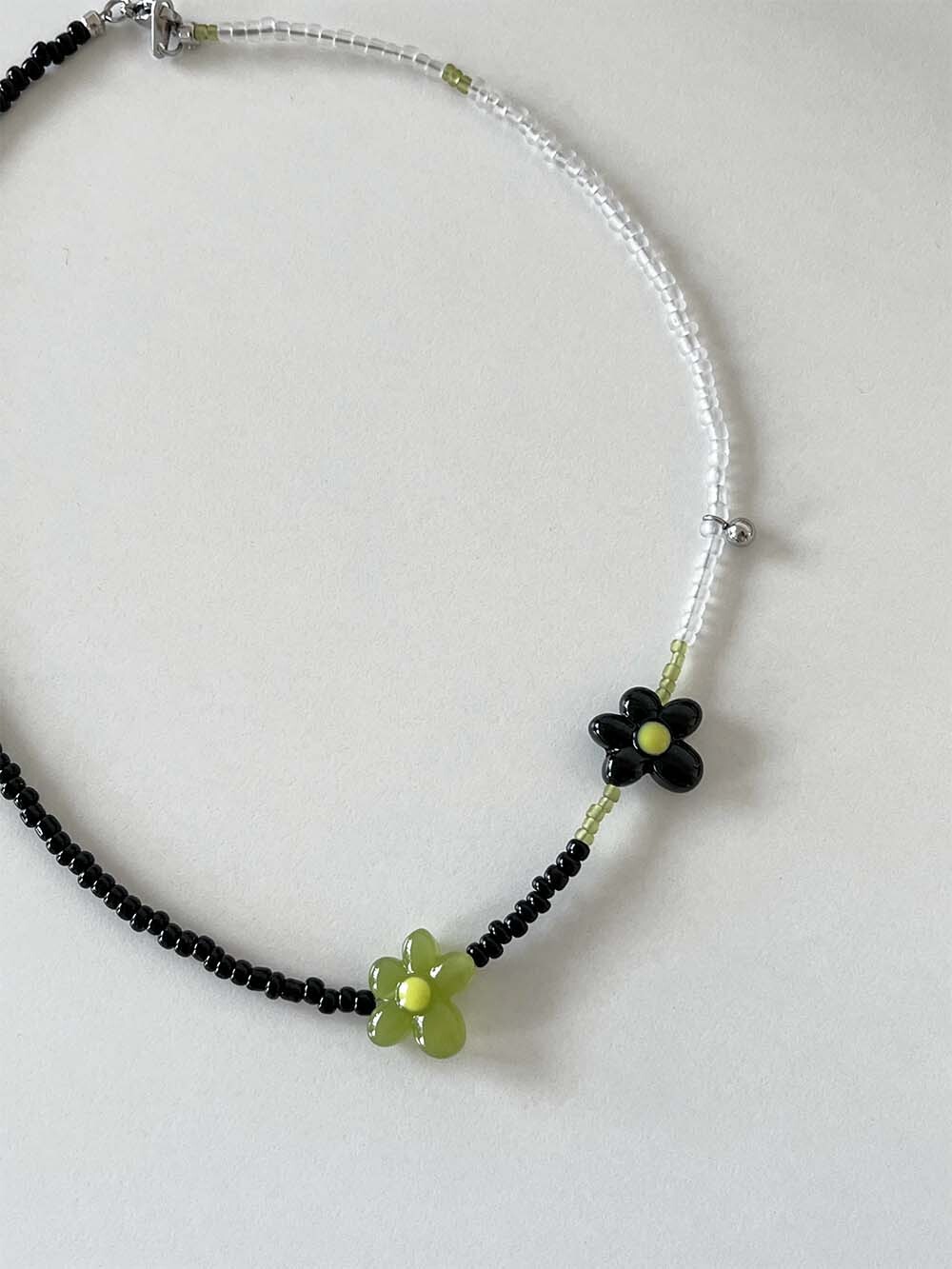 꽃과 세 가지 색상의 비즈로 만들어진 목걸이입니다.