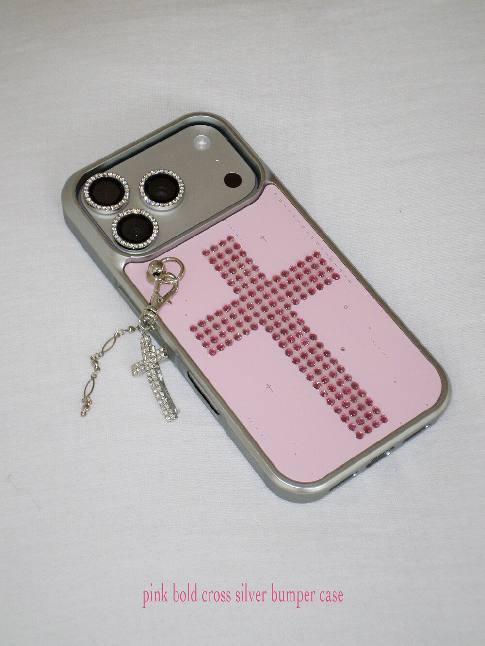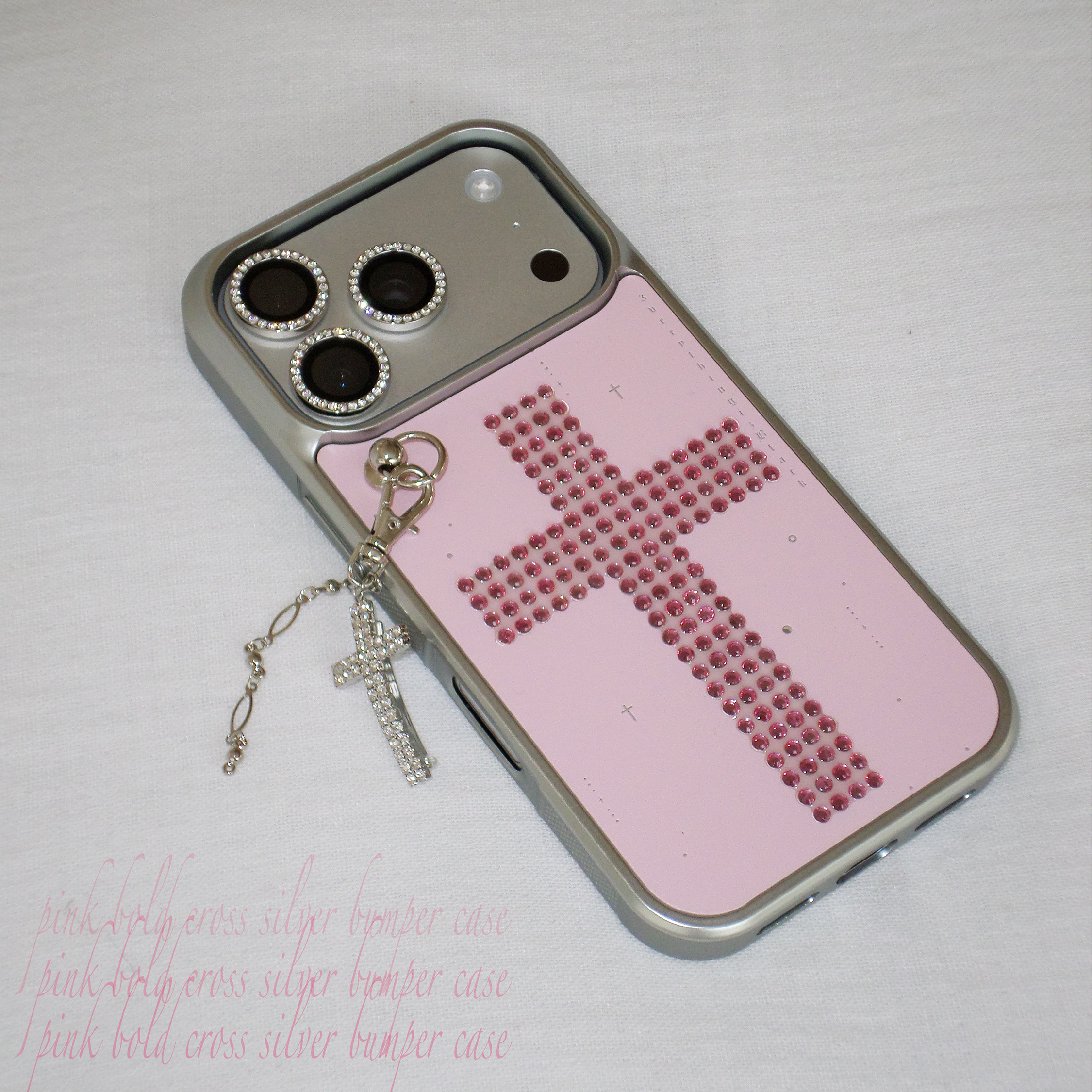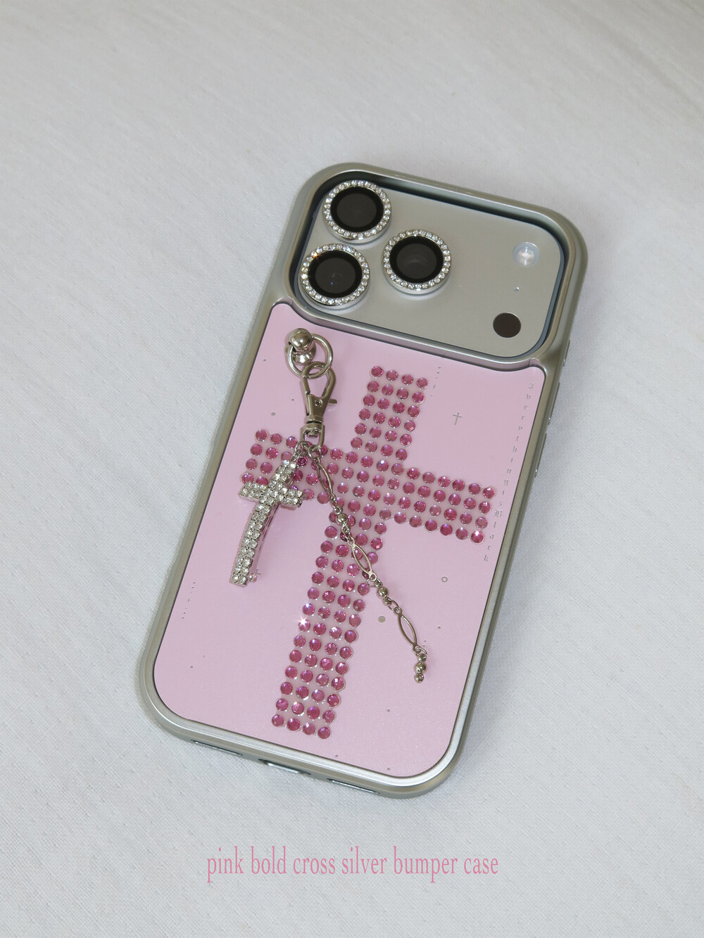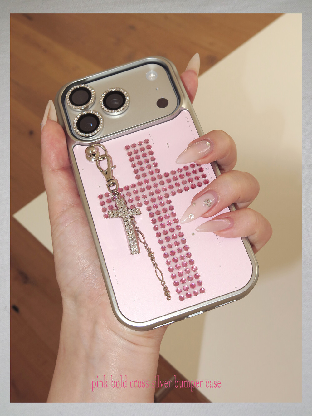 볼드한 크로스 핑크 큐빅에 디자인이 들어간 미러 실버 범퍼케이스 입니다.