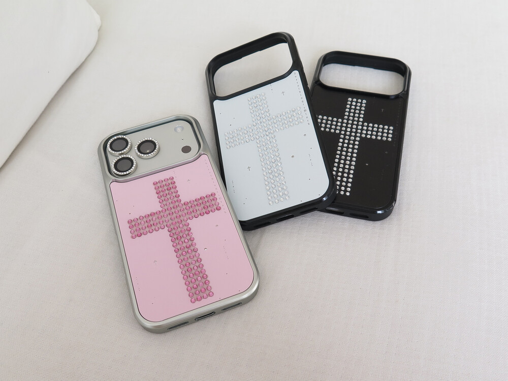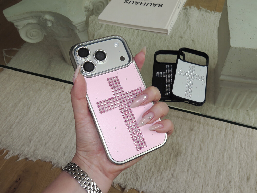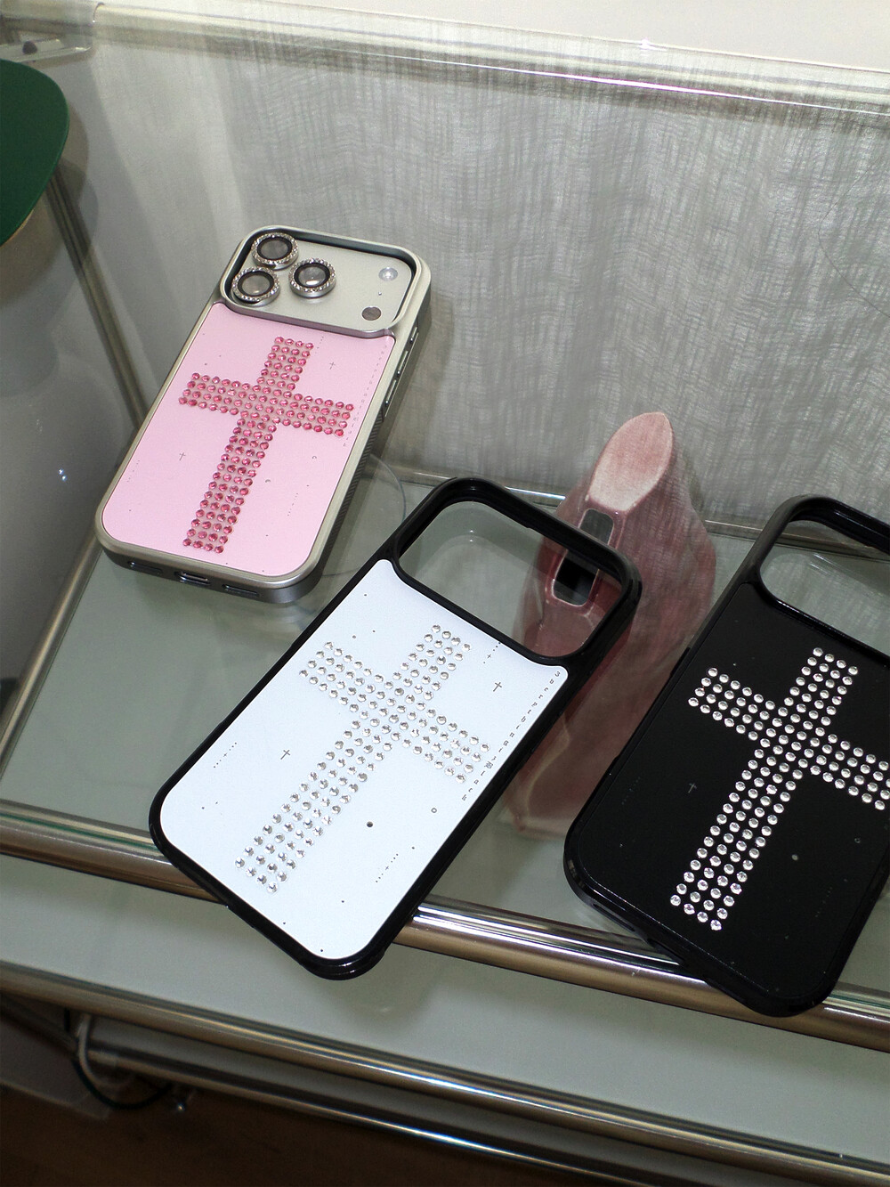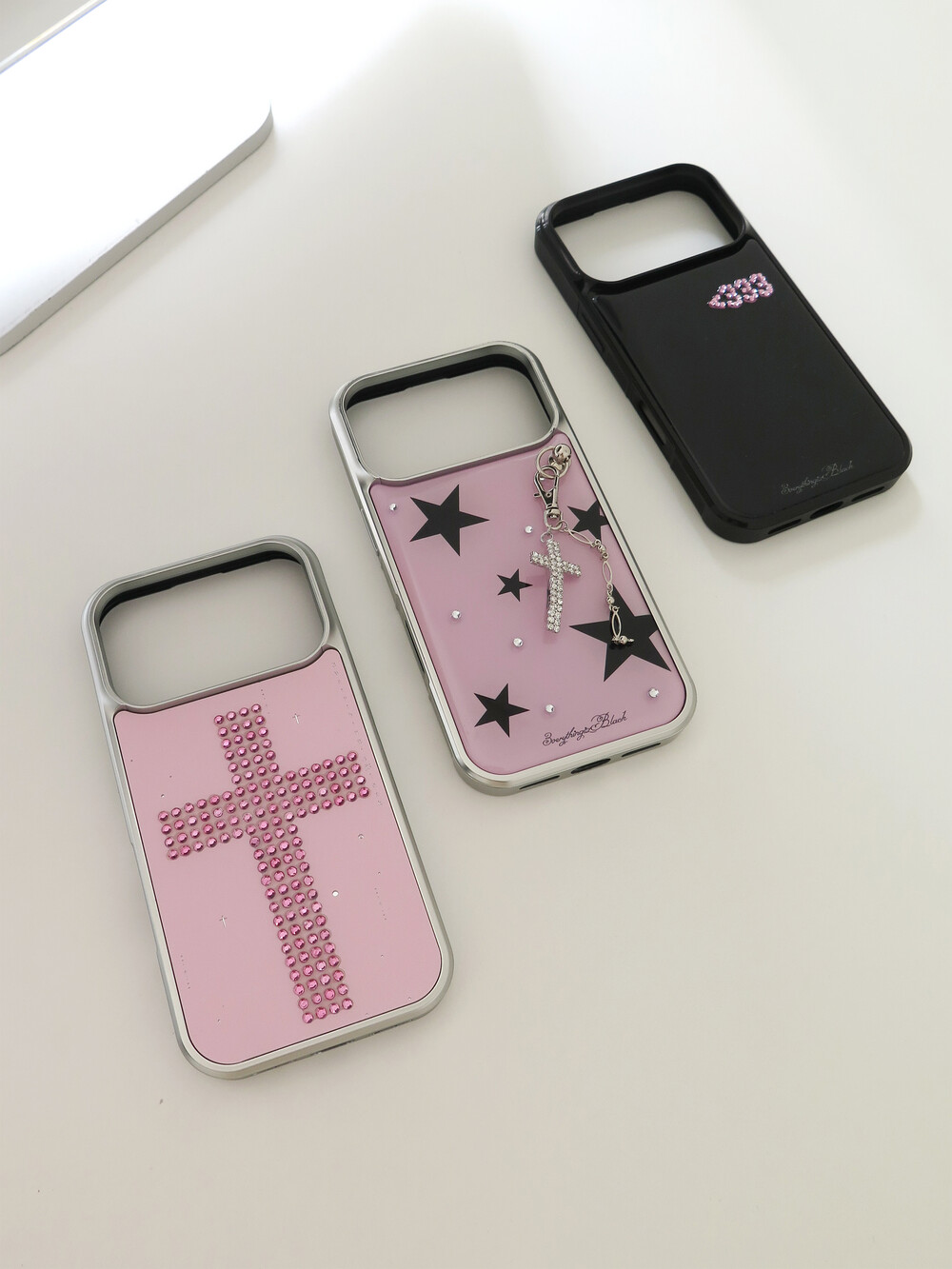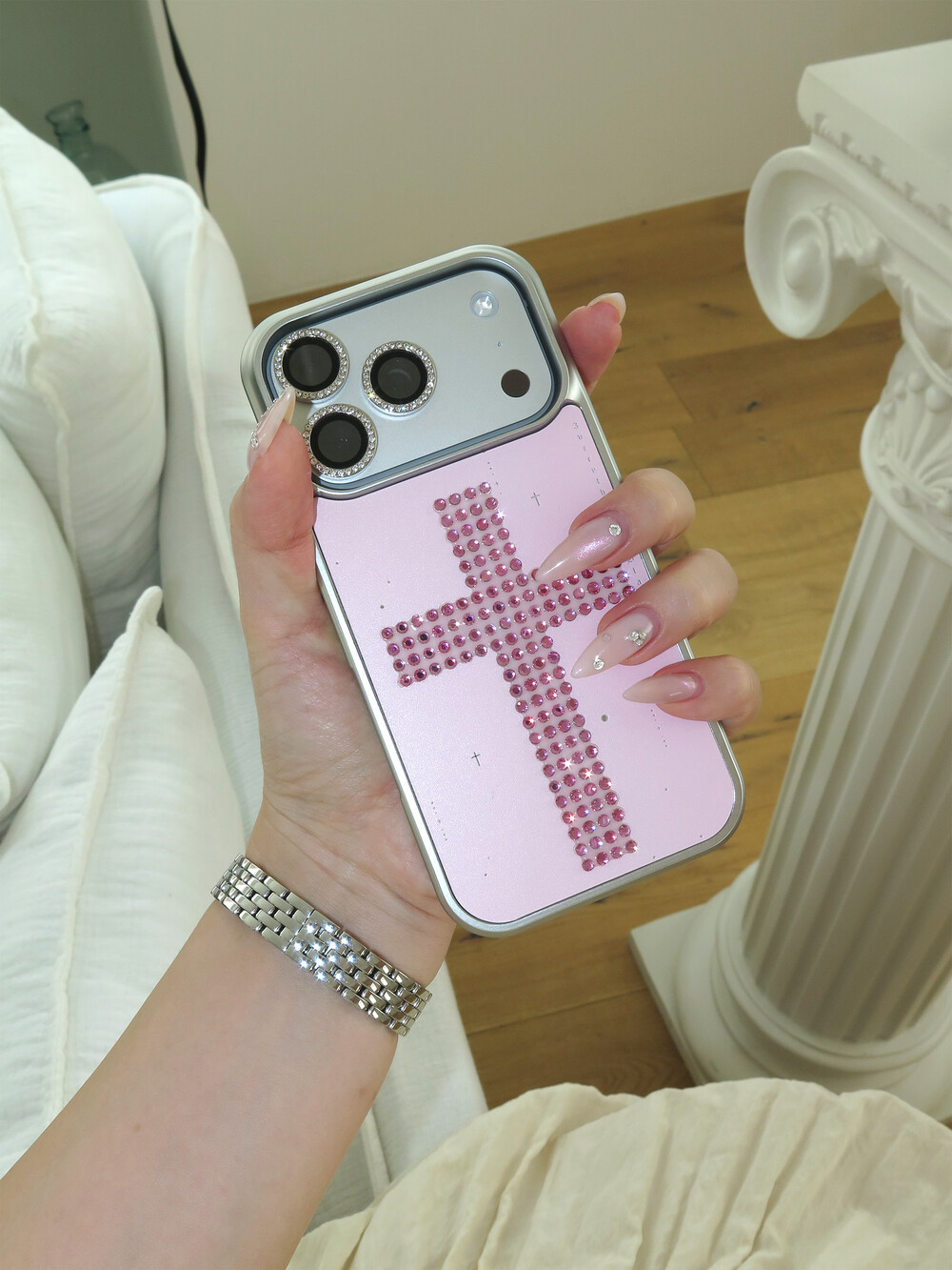 볼드한 크로스 핑크 큐빅에 디자인이 들어간 미러 실버 범퍼케이스 입니다.
