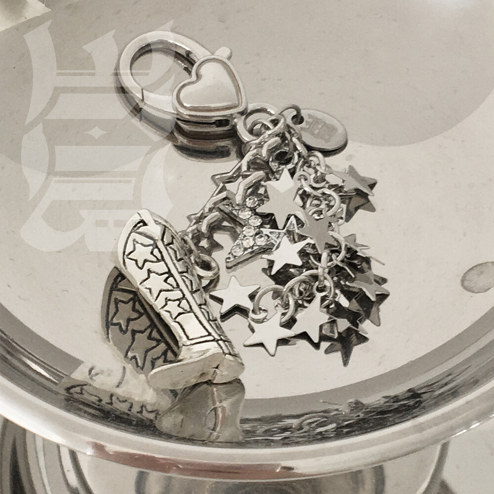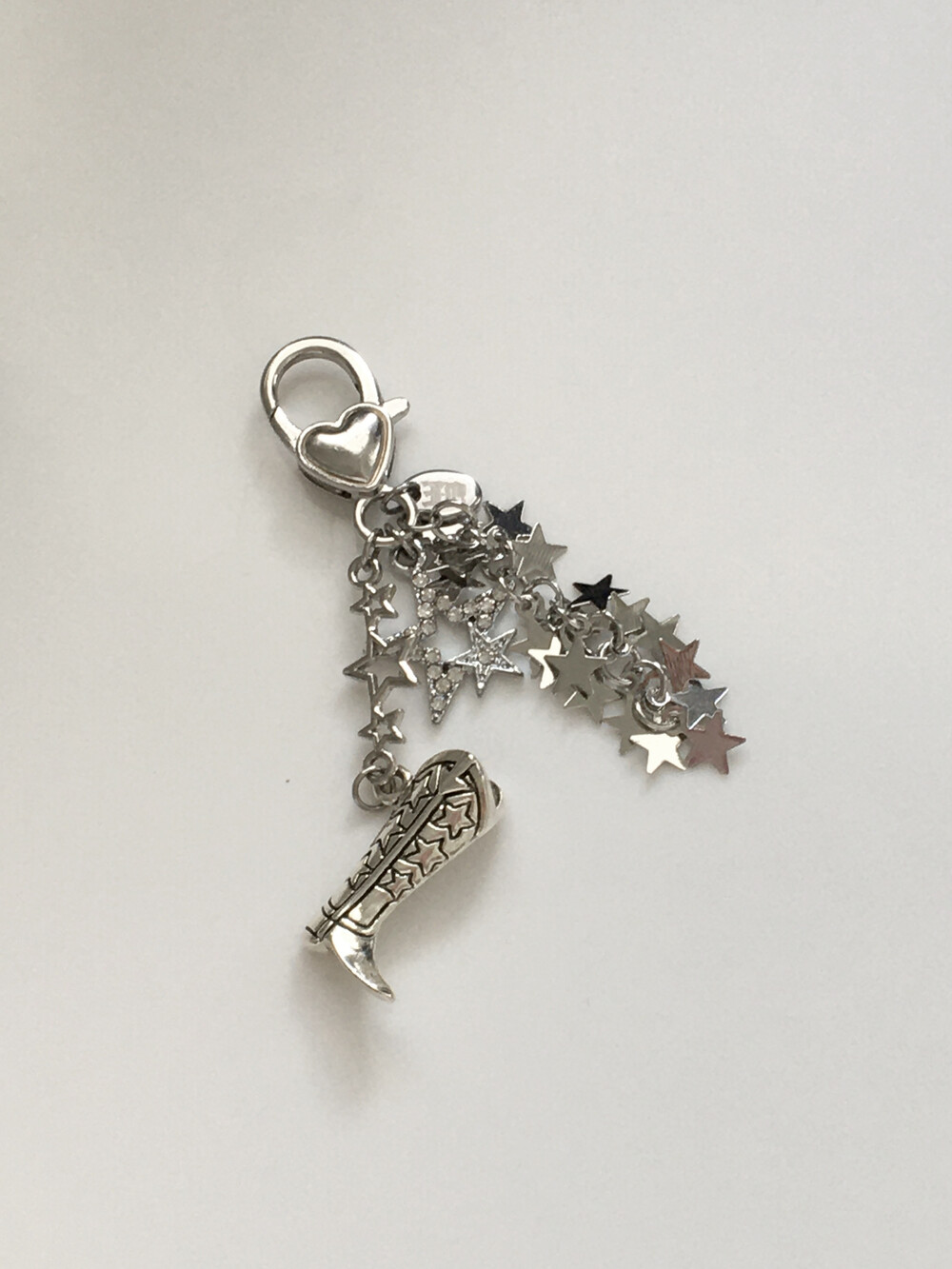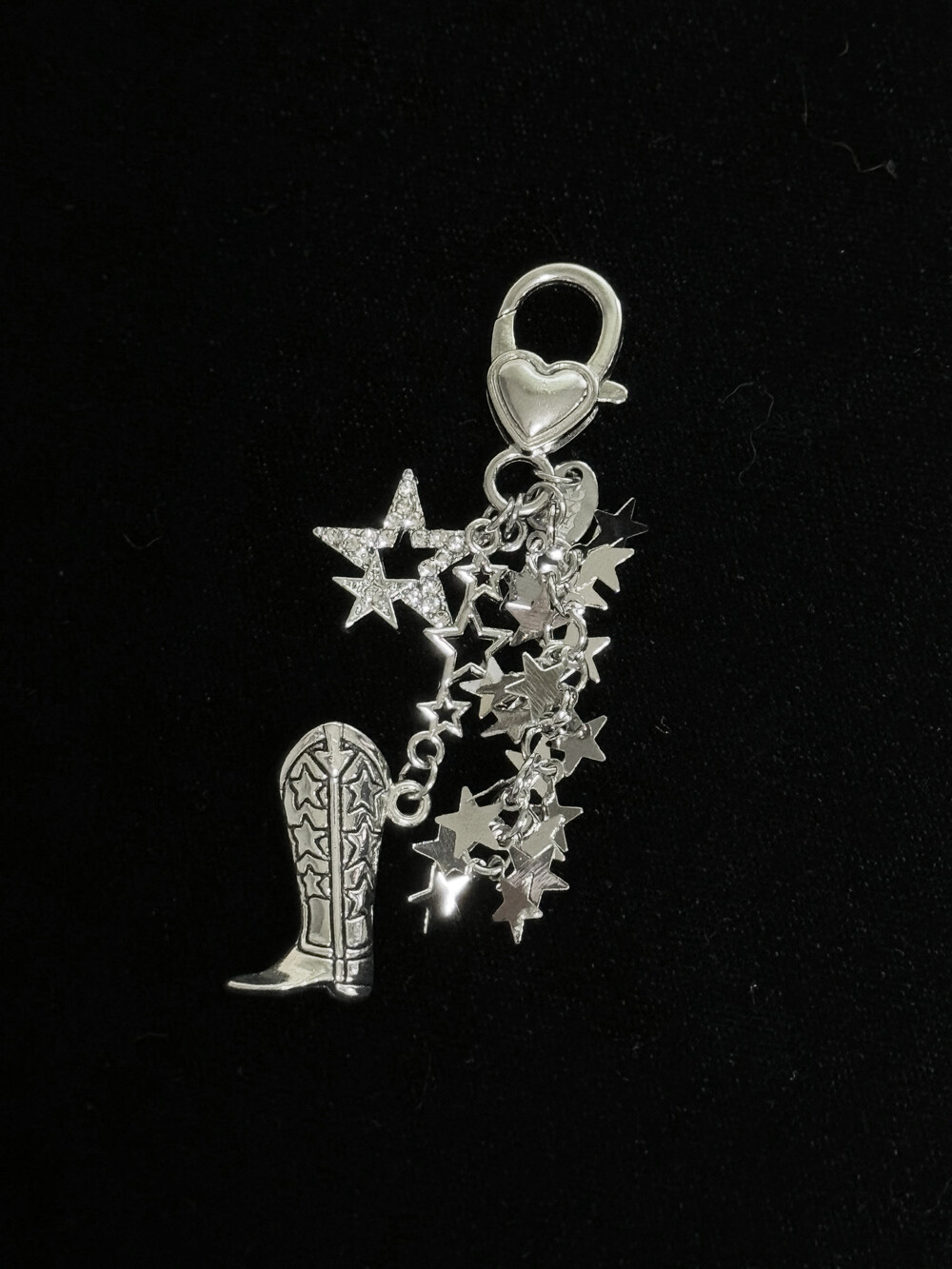 반짝이는 별과 웨스턴 부츠 참이 달린 키링입니다.