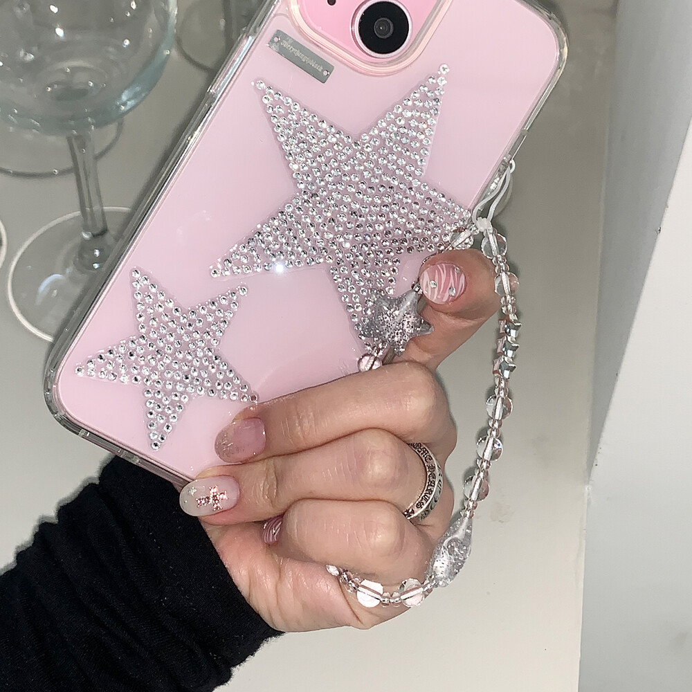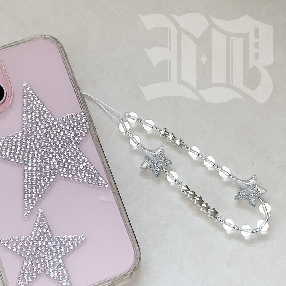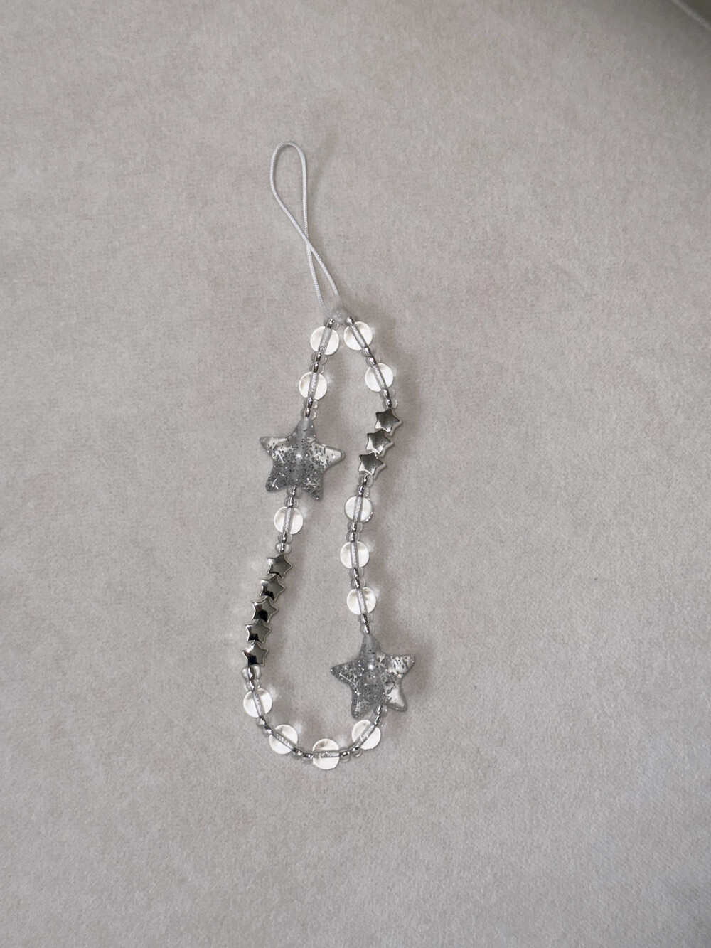 투명 비즈와 반짝이는 별 모양 참으로 구성된 스트랩 키링입니다.
